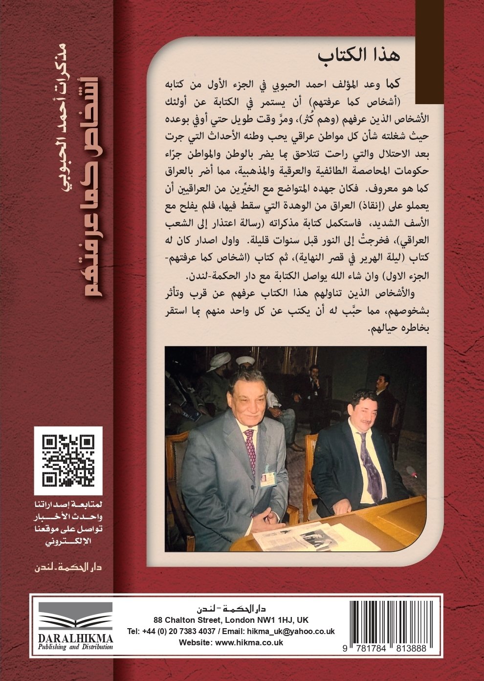 كما وعد المؤلف احمد الحبوبي في الجزء الأول من كتابه أشخاص كما عرفتهم أن يستمر في الكتابة عن أولئك الأشخاص الذين عرفهم وهم كثر)، ومر وقت طويل حتي أوفي بوعده حيث شغلته شأن كل مواطن عراقي يحب وطنه الأحداث التي جرت بعد الاحتلال والتي راحت تتلاحق بما يضر بالوطن والمواطن جزاء حكومات المحاصصة الطائفية والعرقية والمذهبية، مما أضر بالعراق كما هو معروف فكان جهده المتواضع مع الخيرين من العراقيين أن يعملو على (إنقاذ) العراق من الوحدة التي سقط فيها، فلم يفلح مع الأسف الشديد فاستكمل كتابة مذكراته (رسالة اعتذار إلى الشعب العراقي)، فخرجت إلى النور قبل سنوات قليلة، وأول اصدار كان له كتاب اليلة الهرير في قصر النهاية، ثم كتاب اشخاص كما عرفتهم. الجزء الأول) وان شاء الله يواصل الكتابة مع دار الحكمة لندن.